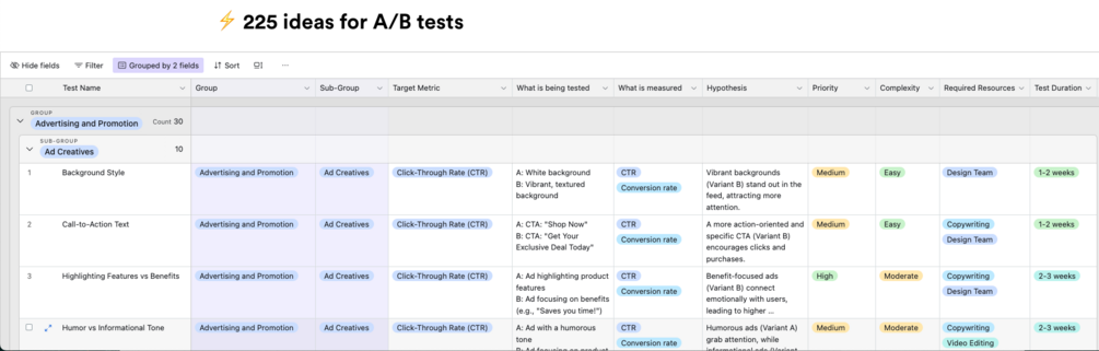 Discover a comprehensive database of 225 A/B testing ideas tailored for e-commerce optimization. Perfect for marketers, analysts, and online store owners, this resource is designed to boost conversion rates, reduce cart abandonment, and increase AOV.