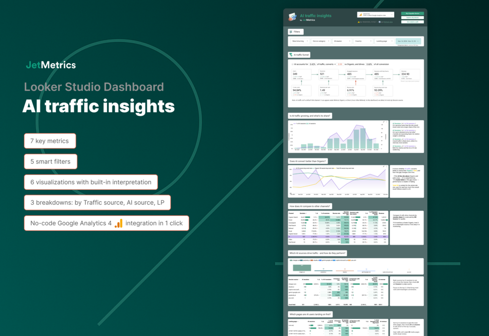 - 6 visualizations with built-in interpretation: AI traffic funnel · AI sessions trend · CR comparison · Channel comparison · AI sources breakdown · Landing pages analysis